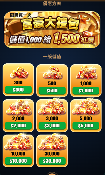 紅鑽娛樂城提供的儲值額度相當彈性,從最低300元起跳,一直到最高30000元,共有八種固定金額可選。這種設計對新手而言非常友善,因為能從小額開始體驗,不需要一開始就投入大量資金,也避免了初期嘗試時的不安感。而對於老玩家或高額操作的用戶,平台則提供10000元與30000元的選項,以利進行大量紅鑽兌換或連續性投注操作。值得一提的是,平台也提供「限購一次」的1000元豪華大禮包方案,標榜「儲值1000給1500 紅鑽」,等於額外送出 500 紅鑽的回饋,吸引不少新手首儲時先從此方案下手。