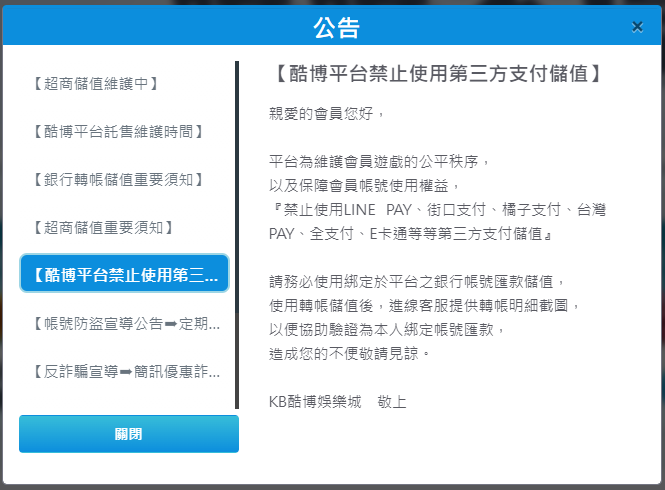 小編在酷博娛樂城官網上看到一則公告,內容指出平台嚴格禁止使用第三方支付,如LINE PAY、街口支付、台灣PAY等,要求玩家只能透過綁定於平台的銀行帳號進行儲值。