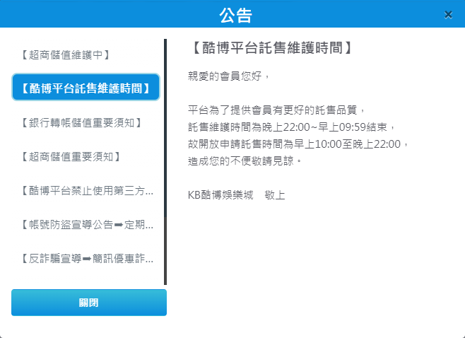 在酷博娛樂城的公告中可以看到有關託售維護時間的訊息,乍看之下好像是在為玩家提供一個「更好的託售品質」,但實際上,這樣的時間限制給許多玩家帶來了不少困擾。根據公告內容,託售系統的維護時間為晚上22:00至早上09:59,這意味著玩家只能在早上10:00至晚上22:00這段時間內申請託售。這樣的安排不僅大幅壓縮了玩家的自由操作時間,也讓人開始質疑:這樣的限制真的是為了玩家的利益嗎?