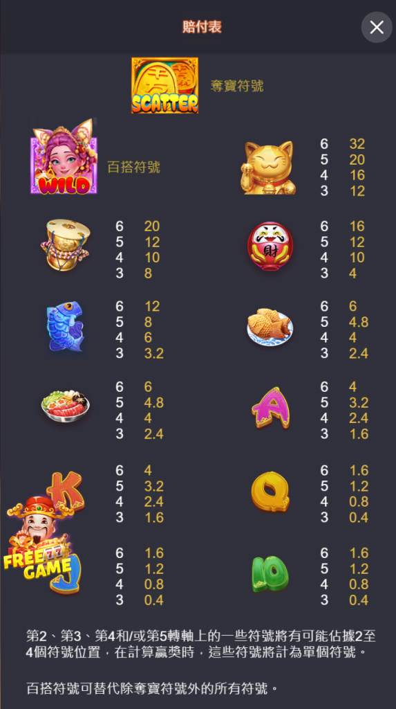 1. 第一次免費旋轉觸發2個招財貓符號,倍數增加至x6。