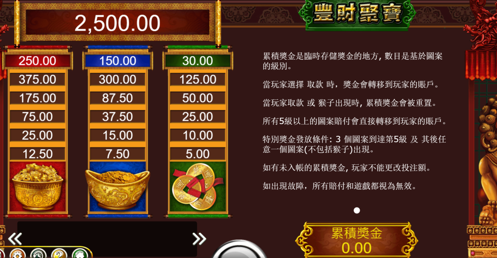 此外,《豐財聚寶》的累積獎金設計層次分明,每個等級的獎金都能讓玩家感到目標明確。例如,當金碗或金元寶圖案達到第五級後,即可觸發令人興奮的高額彩金,最高可達250.00。這種逐步升級的過程,讓玩家始終感到充滿挑戰與期待。
