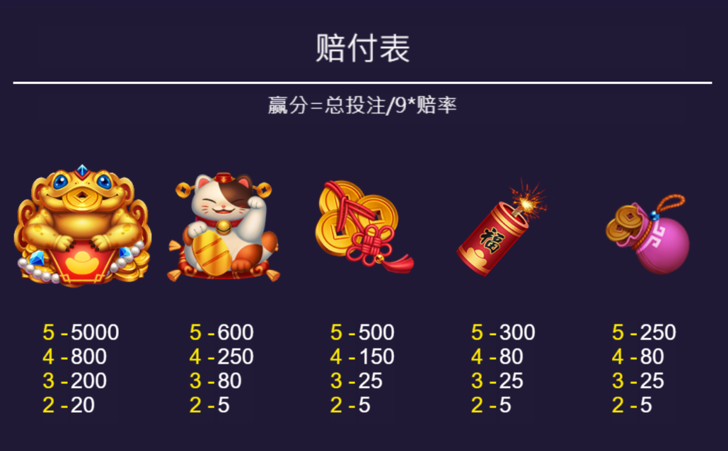 最令人期待的符號莫過於金蟾蜍,五個金蟾組合可帶來5000倍的高額賠付,我認為這絕對是玩家追求的終極目標之一。另一個高價值的符號是招財貓,其五連線的600倍賠付雖然略遜一籌,但仍然充滿吸引力。而金蟾與招財貓的出現,無疑增添了濃厚的吉祥寓意,讓人倍感幸運。