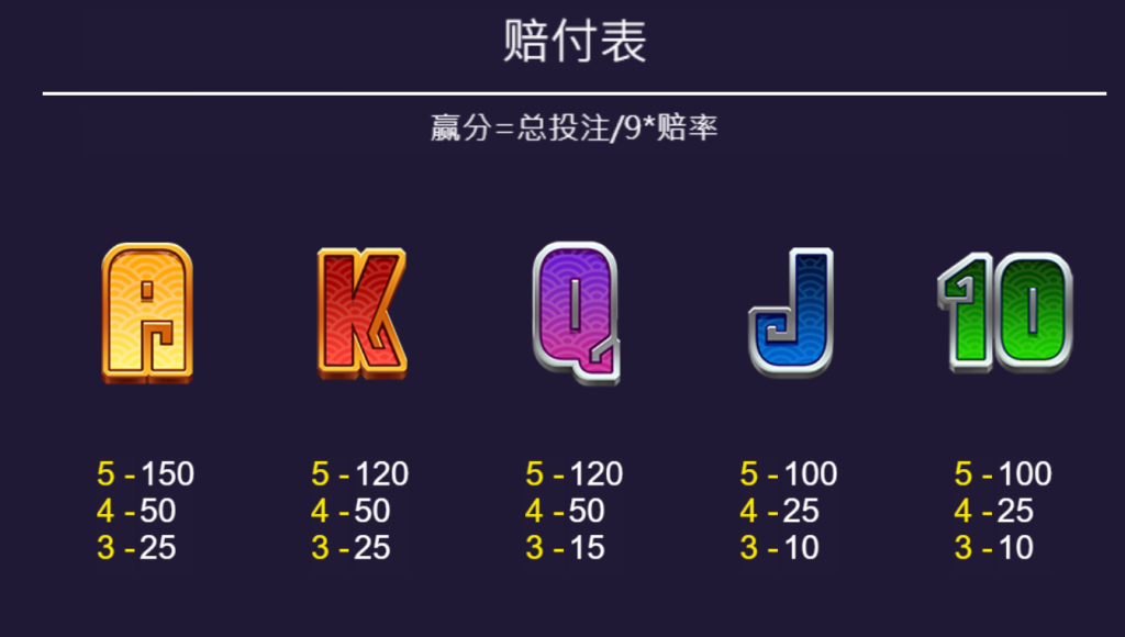 基礎符號則選用了A、K、Q、J、10等經典牌面,並加以傳統紋樣裝飾。我認為這不僅提升了整體視覺感受,也讓玩家感到熟悉且親切。儘管其賠付倍數相對較低,五個連線的最高回報可達150倍,但在頻繁出現時,依然能讓玩家保持興奮與參與感。