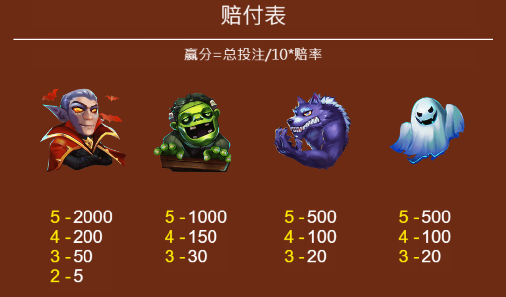 從賠付圖表中可以看出,吸血鬼是遊戲中價值最高的符號,五連線賠率高達2000倍,無疑是玩家追求高額獎金的首選目標。我覺得,這樣的高回報設計為遊戲增添了極大的吸引力。此外,殭屍符號提供1000倍的五連線賠率,而狼人與幽靈符號的五連線賠率則分別為500倍,這些符號既延續了萬聖節的驚悚氛圍,也讓玩家有更多的高額獎勵機會。