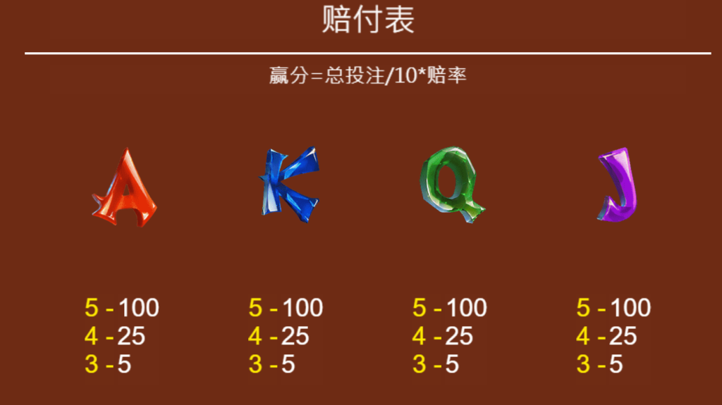 在中低賠付符號中,A、K、Q、J等字母符號作為基礎得分來源,五連線的賠率為100倍,適合喜歡穩定小額收益的玩家。我認為,這些符號的存在為遊戲提供了平衡性,讓玩家無論追求高額回報還是穩定收益,都能找到適合自己的策略。