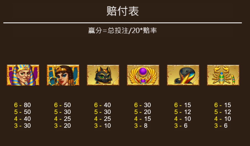 在《埃及王朝》中,最高賠付的圖標是法老,當玩家成功連線6個法老圖標時,賠付倍數可達80倍,成為遊戲中最值得追求的高價值符號。我覺得這種設計非常有吸引力,因為它既具有挑戰性,也提供了巨額回報的可能性。而女王圖標的賠付次之,6個連線的賠付倍數為50倍,同樣是玩家期待的大獎圖標。