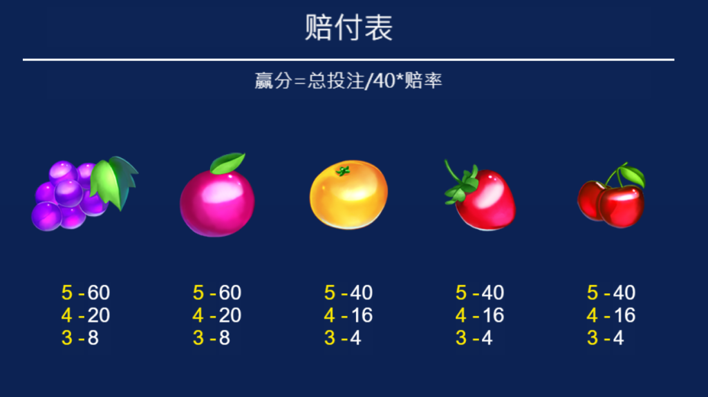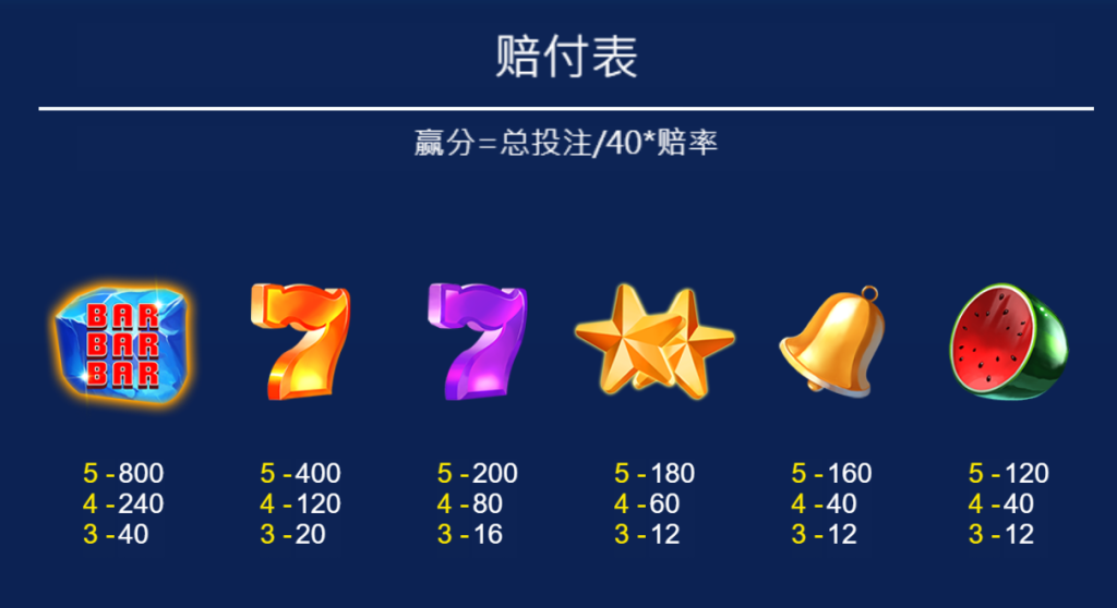 《冰果霸》的賠付公式為贏分=總投注/40×賠率,這樣的透明計算方式讓玩家能清楚了解自己的每一次旋轉如何影響最終收益。我認為這樣的設計大大提升了玩家的信任感,也讓遊戲更具公平性。