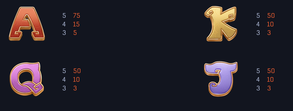 字母與數字符號(A、K、Q、J)則代表低賠付範疇,但它們的出現頻率較高,五連線可提供50至75倍不等的回報。我覺得,這些符號在遊戲中起到了平衡的作用,為玩家提供了穩定的基礎回報,特別適合新手玩家或喜歡小額累積的玩家。