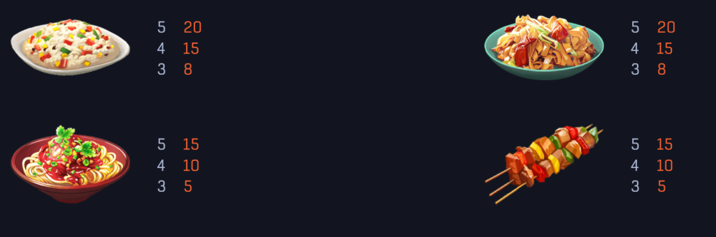 在基礎符號部分,義大利麵、蛋炒飯和串燒則是小幅度的回報象徵,湊齊5個分別帶來20倍或15倍的回報。我覺得這些符號設計是為了保持玩家的遊戲體驗不間斷,即使是小獎金也能帶來一種穩定的滿足感。