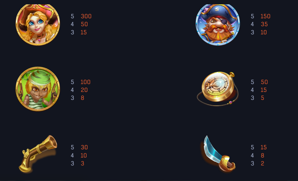 最高價值的圖案是金髮女海盜角色。當出現五個相同圖案時,能賠付高達300倍,這無疑是整場遊戲的明星圖案。我覺得這也暗示了她在遊戲背景故事中的重要地位,也許她是這艘船上的靈魂人物,帶領著整個團隊尋寶。
