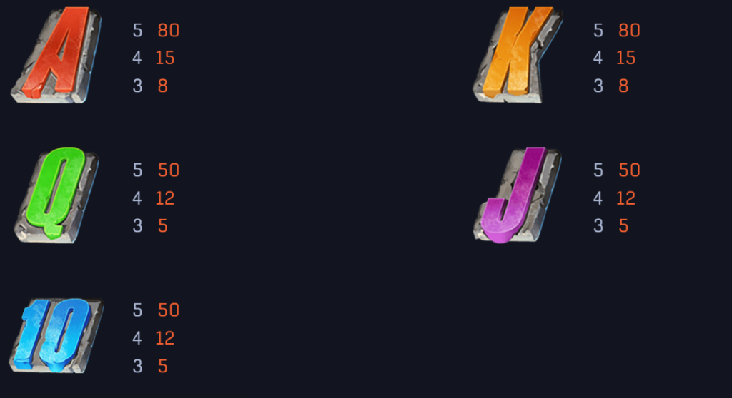 而基礎符號部分,包含A、K、Q、J和10等經典字母符號,其最高賠付範圍為50至80倍。我覺得這些符號的設計以石刻風格為主,呼應了遊戲的遺跡主題,為玩家帶來了沉浸式的探險感受。