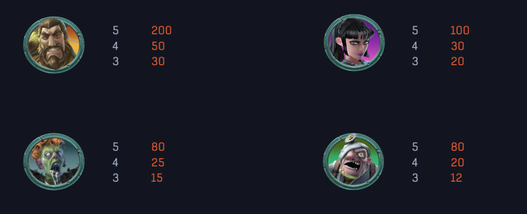 最高賠付的符號是勇敢的獵人角色,當五個相同符號連線時,賠付高達200倍。這位獵人象徵著對抗喪屍的勇氣與力量,他的高賠付設計也表現出他在遊戲劇情中的核心地位。