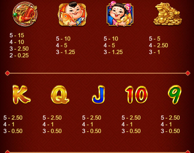 遊戲中的高價值符號以充滿年味的圖案為主,包括錦鯉、抱魚童子、金元寶童子和金錢龜。其中,錦鯉符號的最高賠付為15倍,是遊戲中回報最高的符號。我覺得這樣的設計非常符合中國文化中「年年有餘」的寓意,每次看到錦鯉符號時都會讓人倍感期待。