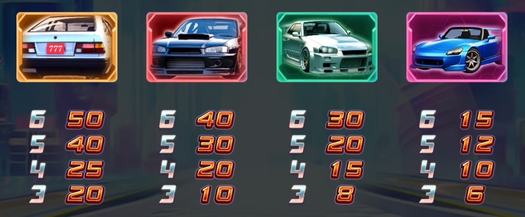 《極速飄移》賠付圖的設計充分體現了遊戲的速度與激情主題,每個符號都以賽車的元素為基礎,增強了視覺上的震撼效果。我認為《極速飄移》的賠付設計平衡了高風險與穩定回報的需求,無論是追求大獎還是享受遊戲樂趣的玩家,都能在這款遊戲中找到自己的滿足感。