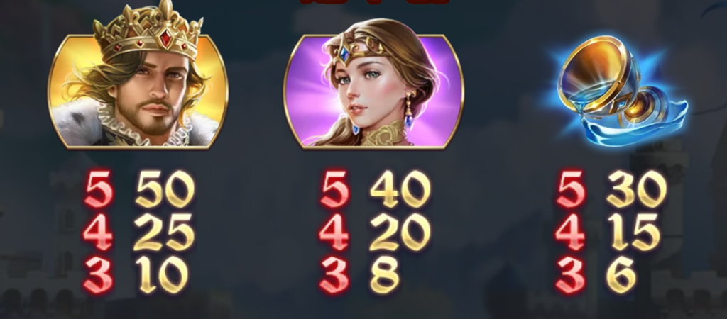 皇后則緊隨其後,滿足5個符號時,獎勵為40倍。我認為這象徵了亞瑟王與皇后的王室聯盟,也為玩家帶來了豐厚的回報。