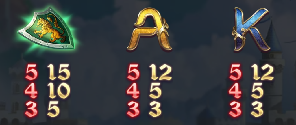 獅子盾牌作為英勇的象徵,出現5個時可獲得15倍的賠付。我覺得這個符號不僅增添了遊戲的故事性,還讓玩家感覺參與了一場保衛王國的戰鬥。