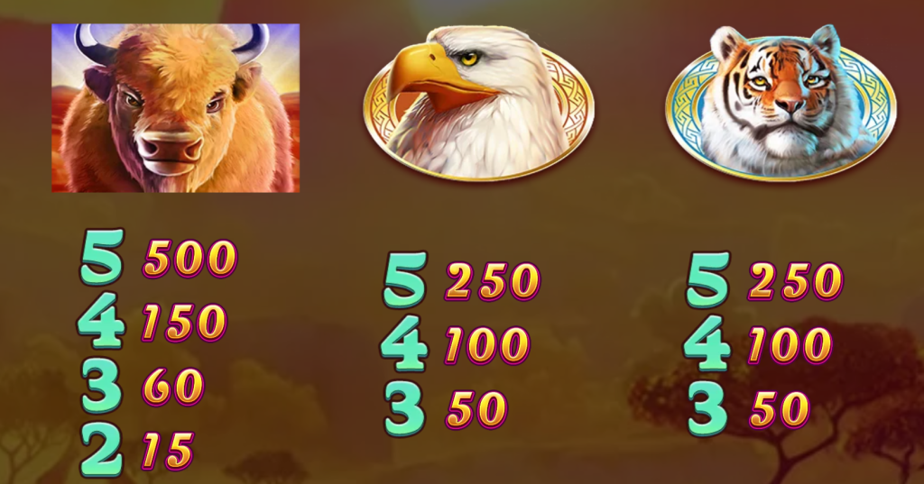 黃金水牛作為遊戲中的高獎符號,當玩家獲得5個時,將獲得最高的500倍賠付。4個水牛符號會帶來150倍,3個則為60倍,2個水牛符號還是能獲得15倍的獎勳。我認為這樣的設計讓玩家有更多的機會在較小的匹配中也能獲得豐富的回報。