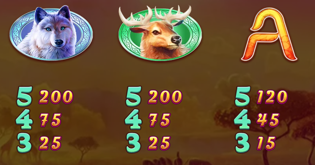 狼和鹿這些動物符號的賠付為200倍、75倍和25倍,儘管這些數字稍低,但仍然具有吸引力,並且適合那些在較低風險下尋求穩定回報的玩家。