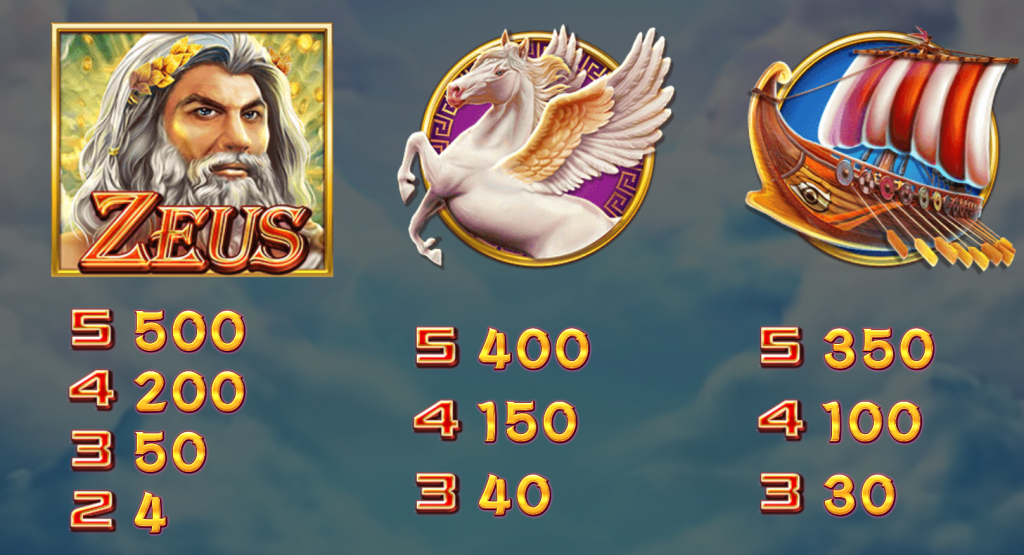 遊戲採用5軸3排的經典設計,並提供多條贏取線路,讓玩家能感受到豐富的中獎機會。宙斯符號作為高價值符號,帶來超高回報,而WILD符號則可替代其他符號,增加贏取機會,讓每次旋轉都充滿驚喜。