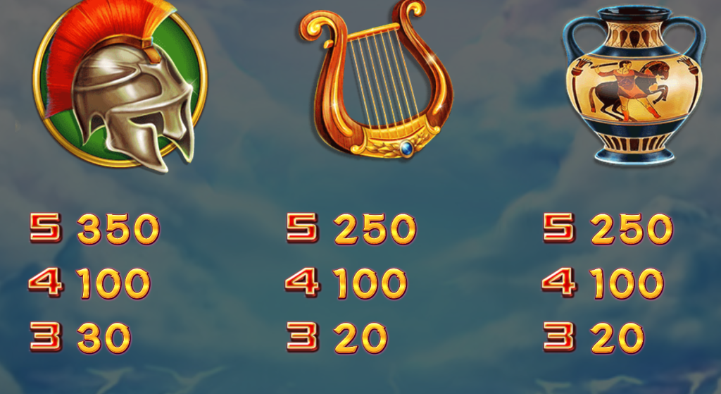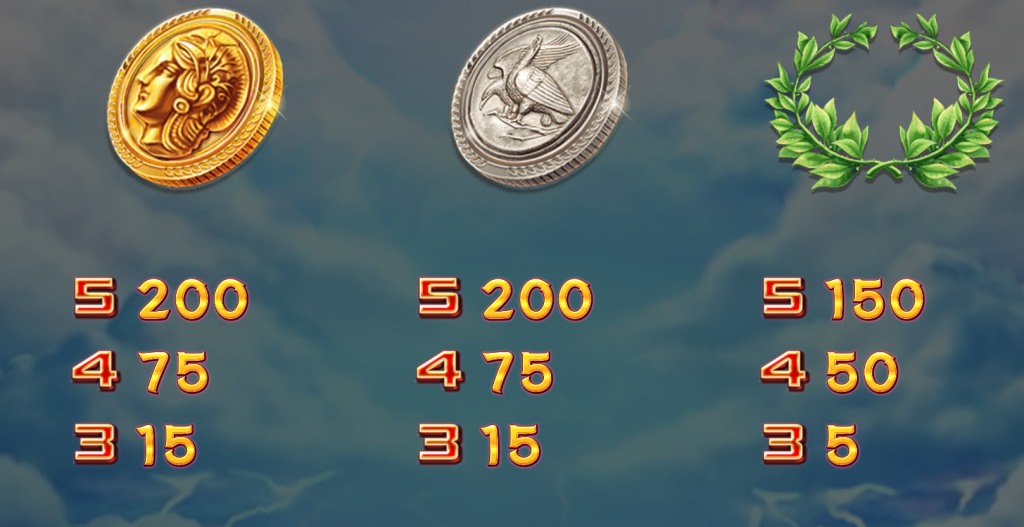 中價符號則包括希臘戰盔、七弦琴與古希臘陶瓶,5連線最高可分別帶來350倍與250倍的賠付。我認為,這些符號的加入不僅豐富了遊戲的文化背景,也為玩家提供了穩定的中等回報。而低價符號如金幣、銀幣與月桂冠,則分別象徵了財富、榮耀與勝利,最高賠付在150至200倍之間,為遊戲的連線回報提供了多樣的選擇。