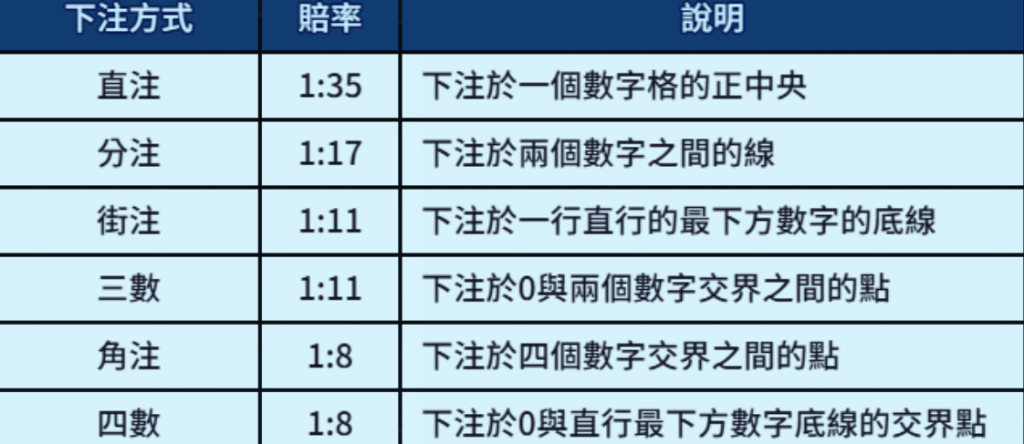 從上方圖片中可以看出,遊戲分為內圈投注和外圈投注,每一種投注都有其獨特的賠率設定,讓人不禁想試試自己的運氣。