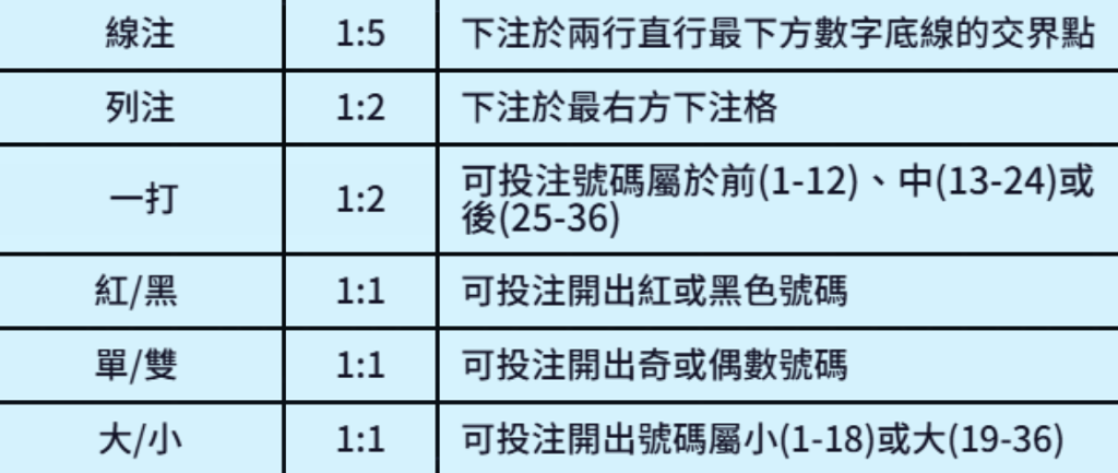 外圈投注則更多考慮玩家的策略與偏好。例如「紅/黑」和「單/雙」等投注方式,以 1:1 賠率吸引保守型玩家;而「一打」和「列注」提供 1:2 的賠率,讓玩家能夠挑戰更大的範圍。