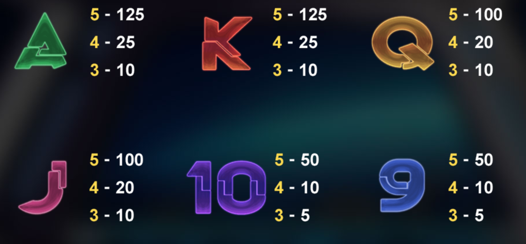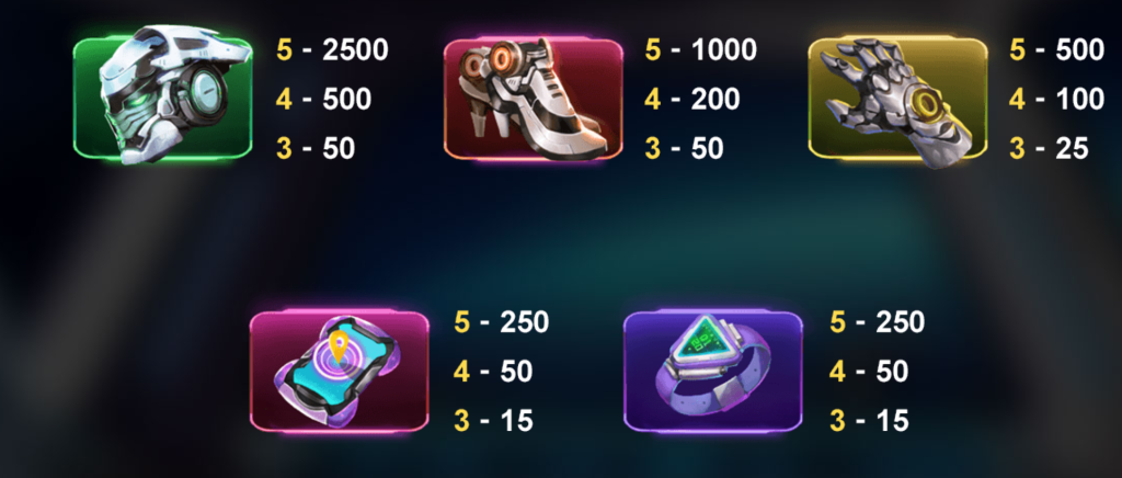 遊戲採用五軸三排的設計,搭配多條中獎線,讓玩家有更多機會獲得高額獎勵。圖標設計涵蓋了機械義肢、智慧手環、未來感頭盔、科技鞋等符號,每一個元素都象徵著未來世界的無限可能。