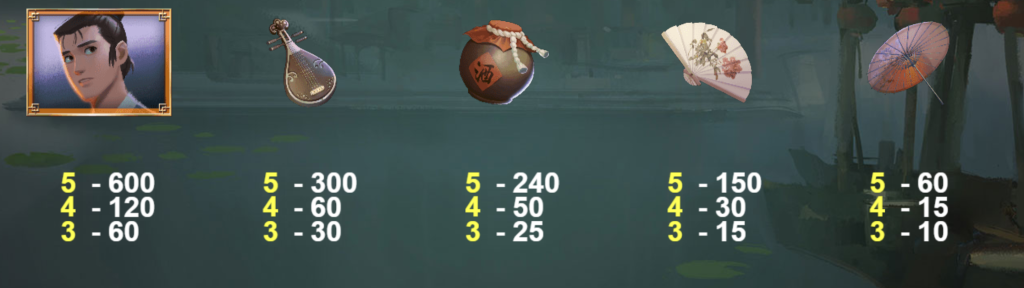 琵琶圖標也是較高價值的符號之一。獲得5個時可帶來300倍的賠付,4個為60倍,3個則為30倍。這個符號象徵著東方文化的優雅,也在遊戲中承載了中等風險回報的潛力。
