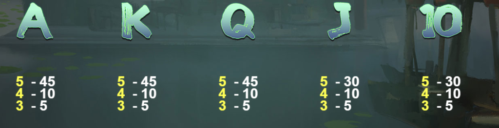 遊戲中還有常見的英文字母符號「A、K、Q、J、10」,這些符號的出現頻率較高,因此賠付相對較低。例如,「A」和「K」5個可帶來45倍的賠付,4個為10倍,3個為5倍;而「Q、J、10」的賠付較低,5個為30倍,4個10倍,3個5倍。