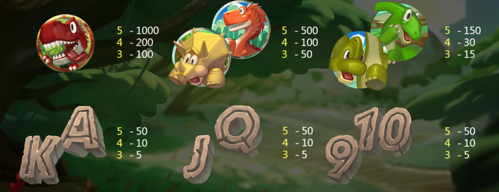 在遊戲中,最高賠付的是霸氣十足的霸王龍符號,當玩家轉出5個霸王龍時,可獲得高達1000倍的回報,4個則有200倍,3個則是100倍。緊隨其後的是三角龍符號,5個可帶來500倍的獎勵,4個則為100倍,3個則有50倍。迅猛龍與其他恐龍圖案的回報則相對較低,但仍具備不錯的獎勵。
