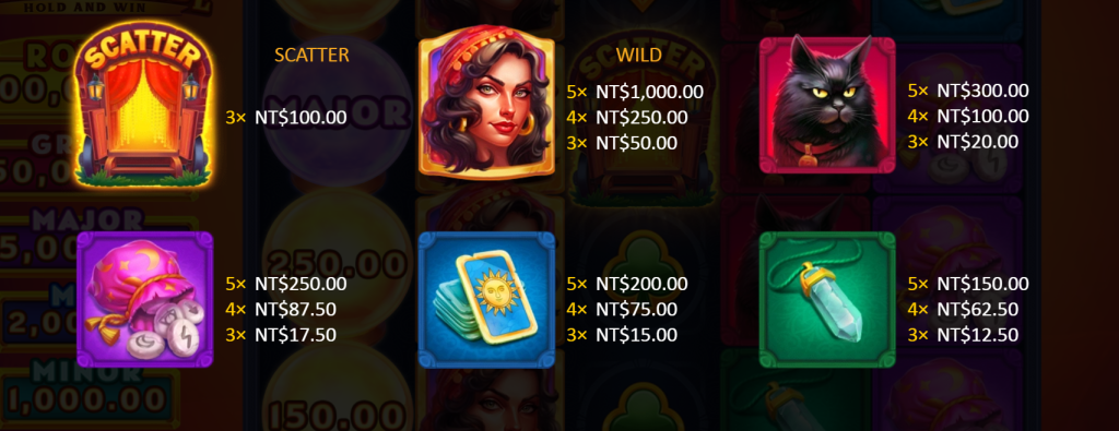 在這款遊戲中,最具價值的符號莫過於美艷的占卜師,她不僅是遊戲的靈魂角色,也是最高賠付的圖案之一。當玩家成功獲得五個占卜師符號時,將可獲得$1000的豐厚獎金,我認為這個設計不僅突出了角色的重要性,也讓玩家對她的出現充滿期待。另一方面,黑貓符號也相當具有價值,五個黑貓符號能帶來$300的獎金,這種設計不僅符合黑貓在神秘學中的象徵意義,也讓整個遊戲充滿濃厚的占卜氛圍。