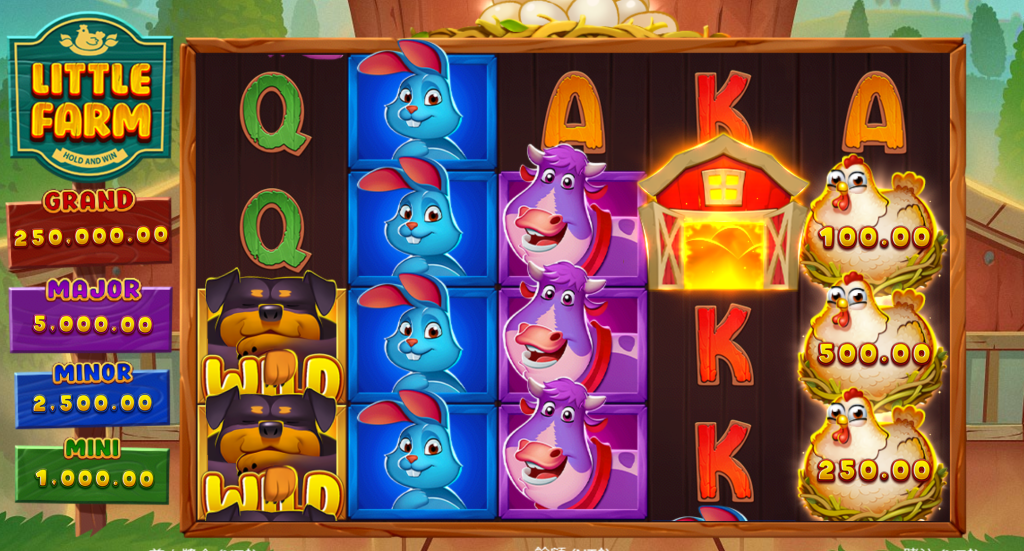 《快樂小農莊-集鴻運》是一款充滿童趣與豐收氛圍的電子遊戲,帶玩家走進一個色彩繽紛的農莊,與可愛的動物們一起收穫驚喜彩金!整體視覺設計充滿歡樂感,從燦爛的陽光、溫馨的農場建築,到各種卡通風格的動物,如藍色兔子、紫色乳牛、兇猛的守護犬、金蛋母雞,都讓人瞬間沉浸在這片農場樂園中。