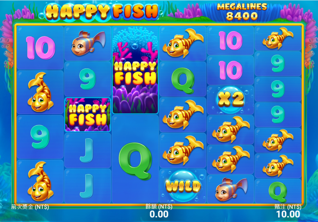轉軸上的金黃色小魚是遊戲中的明星符號,當它們成群出現時,彷彿帶來了一場豐收的魚群狂潮,而「HAPPY FISH」標誌則是觸發獎勵模式的關鍵,為玩家開啟更多驚喜。遊戲內擁有獨特的Megaways機制,提供高達8400種獲勝路線,讓每一次旋轉都充滿變數與機會。