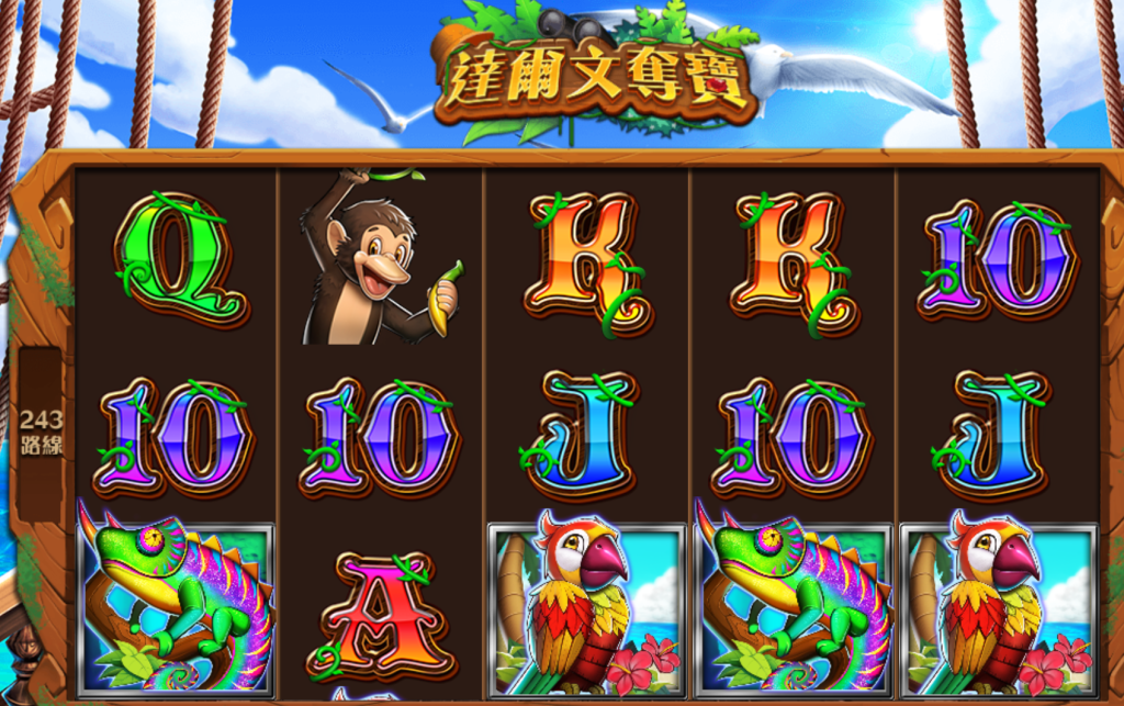 《達爾文奪寶》是RK5電子打造的一款充滿異域探險風格的老虎機遊戲,玩家將踏入熱帶雨林,與猴子、鸚鵡、變色龍等奇幻生物一同尋找傳說中的寶藏。遊戲背景充滿濃厚的自然氣息,木質框架搭配蔓藤纏繞,還有藍天白雲與飛翔的海鷗,讓整體視覺充滿探險氛圍,彷彿置身達爾文筆下的神秘世界。