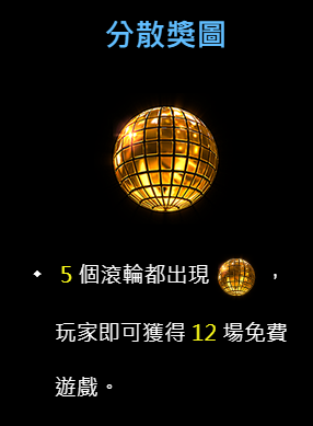 分散圖則是那顆炫目的「金色鏡球」,這圖可不是只為好看,它是免費遊戲的觸發關鍵。只要你在五個轉軸上都看到鏡球,恭喜你馬上進入免費遊戲模式,起跳就送你12場免費轉輪!