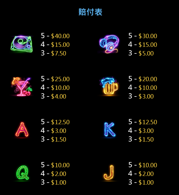 這款遊戲的圖示分成高賠與低賠兩大類,從DJ唱盤、耳機到酒杯、馬丁尼等夜店元素都在其中: