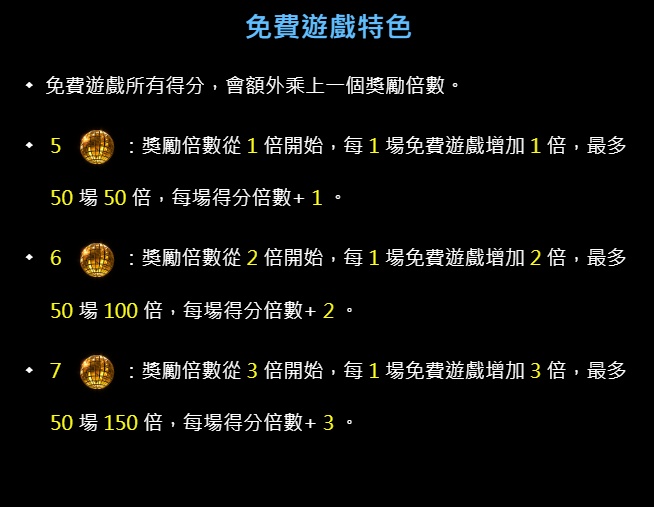 每次免費遊戲的開始,會根據你當時畫面上出現的鏡球數量,來決定整輪免費遊戲的起始倍數與成長速度。