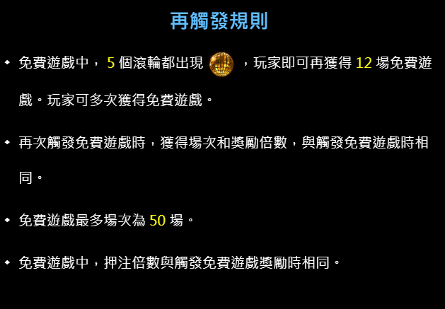 - 所有再觸發回合的倍數設計,將沿用當次觸發的初始倍率邏輯。