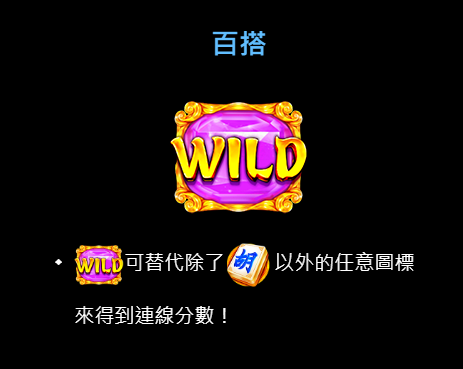 這張圖的功能非常明確——它能夠取代除了「胡」字牌之外的所有圖示,來幫助你完成連線。實際操作中,WILD出現在第2~4輪的機率較高,通常作為中間補位,讓原本兩邊快要連線的圖示瞬間湊齊,完成得分。