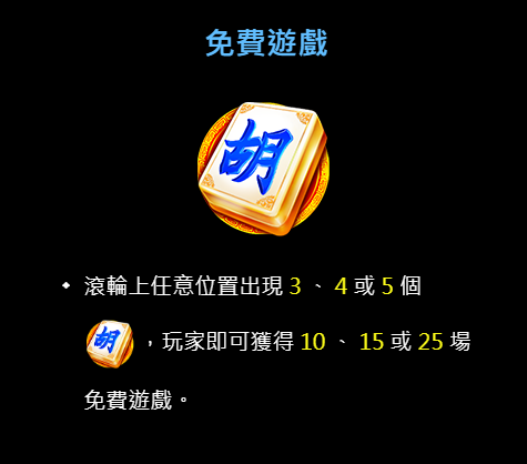 這張麻將牌圖案,是遊戲中另一個爆擊入口。只要畫面上任意位置出現3、4或5個胡字牌,你就能依次觸發10、15、25場免費遊戲。這可不是單純「送你幾場免費轉」,而是一個能夠讓你直接從穩穩小賺進化為瘋狂爆擊的絕佳機會!
