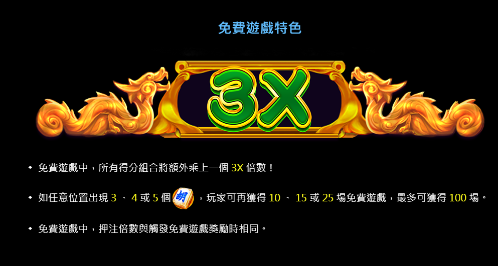 所有得分皆乘上3X倍數不論你中的是小圖還是大圖,只要中獎,就會額外乘上3倍獎勵,免費遊戲中可再觸發與主遊戲一樣,免費遊戲期間若再出現3~5個胡字牌,仍可再獲得對應場數,最多可累積至100場免費遊戲!
