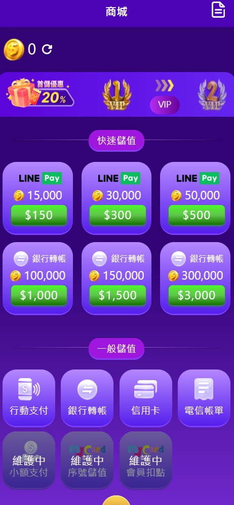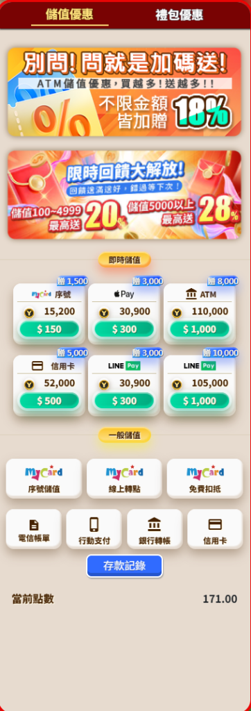 • 信用卡/銀行轉帳/ATM儲值:對於中高額玩家最常使用的金流工具,具備高額回饋與紀錄完整性。