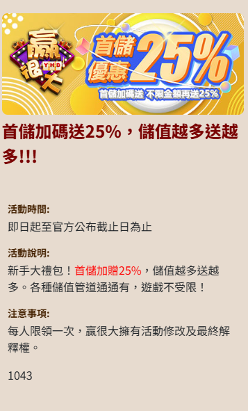如果你是第一次接觸贏很大娛樂城儲值,那麼最不能錯過的就是「首儲加碼25%」這項專屬優惠。只要完成首次儲值,不論金額大小,系統將自動發放高達25%的額外點數作為回饋。