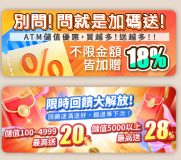 從近期的贏很大娛樂城儲值活動來看,ATM可說是加碼最猛的儲值管道之一。ATM儲值不限金額皆加贈18%,若金額達到NT$5000元以上,更能享有最高28%的限時回饋。