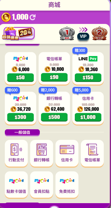 遊戲茄子娛樂城提供相當多元的儲值管道,涵蓋主流第三方支付、實體帳戶轉帳以及點數儲值等類型,顯見平台對不同玩家群體的適應性考量。其中最基本的儲值單位為「金幣」,玩家在商城中可見不同儲值額度對應的金幣數量,並搭配額外贈送比例。