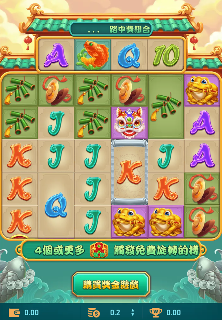 我認為遊戲中最引人注目的特色在於免費遊戲機制,只要轉出4個以上的寶寶符號,就會直接觸發免費遊戲模式。免費遊戲的觸發條件不會太嚴苛,而且搭配購買功能選項,對於習慣直衝高分或想節省等待時間的玩家來說,是一大誘因。搭配高倍率圖騰,例如舞獅和金蟾的6符號倍率分別高達80和50,也讓整體獎勵潛力十足。