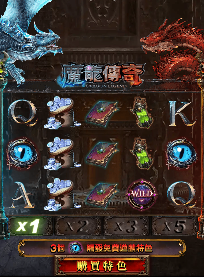 RSG電子推出的《魔龍傳奇》是一款視覺風格極具張力的老虎機遊戲,遊戲畫面採用雙龍對峙的設計,紅龍與藍龍散發出強烈的魔幻氛圍,讓人一開局就彷彿置身於神話戰場中。轉軸上出現的魔法書、藥水、銀幣袋等圖案,全都與龍族冒險息息相關,極具代入感。
