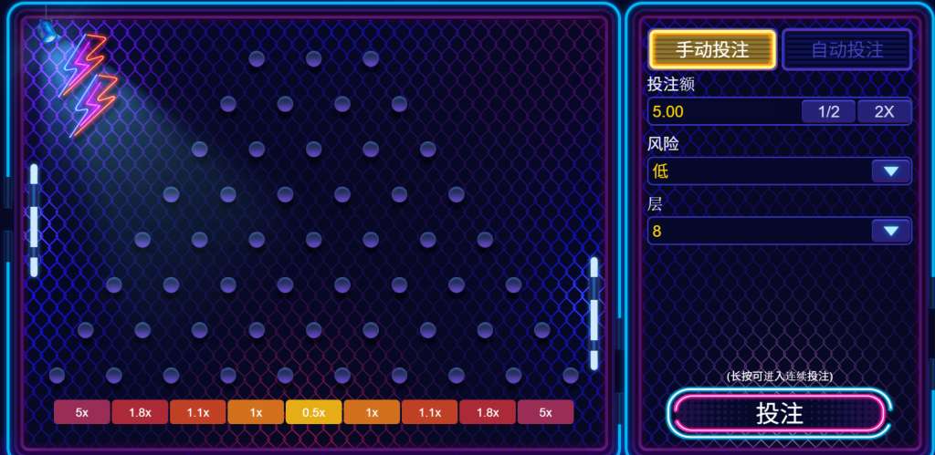 我覺得這款遊戲最讓人著迷的地方,就是它結合了機率與視覺回饋。彈珠每一次落點都是驚喜,你永遠猜不到它會掉進哪個倍率區。從最低0.5倍到最高5倍,風險雖小但刺激十足。畫面左側還有霓虹閃電裝飾,讓整個下注過程更具娛樂氛圍,特別適合喜歡輕鬆投注又想試試運氣的玩家。