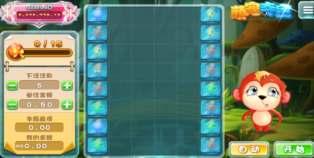 遊戲機制採用9×9方格排列,中間為掉落格區域,左右兩側為隨機等待區,兩側的萌寵圖示隱隱透露著可能觸發的獎勵變化。玩家可依照下方調整投注注數與金額,過程中還能透過收集道具進行特定的獎勵機制。特別的是,畫面上方還有GRAND彩金累積顯示,讓人不禁期待是否能在這場森林冒險中中獎一筆。