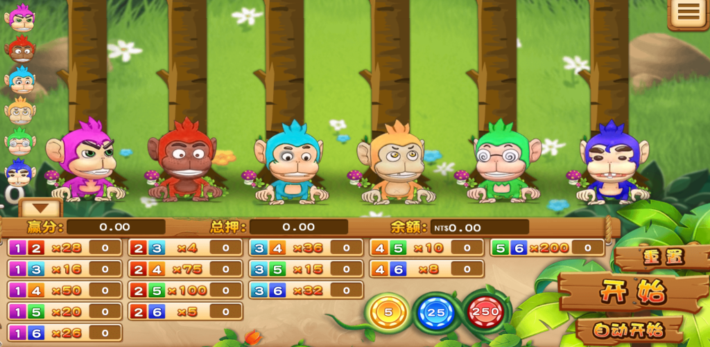從畫面來看,《猴子爬樹》的操作介面非常直觀。左側是每一隻猴子的按鈕,右側則為選單與設定,下注區域則清楚地標示了當前投注金額與預期賠率。我覺得這對新手玩家非常友好,即使從未玩過這類型遊戲,也能在短時間內上手。而畫面下方則是籌碼系統,玩家可以輕鬆選擇欲投入的籌碼金額,這種設計彈性又明確,讓人不容易按錯或誤判。